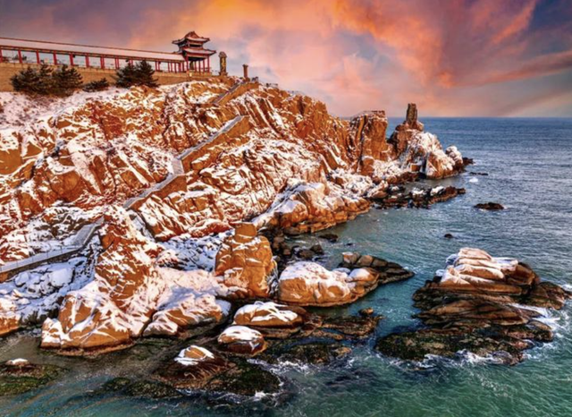 雪后的成山头包裹在一片雪白的童话世界里,雪意苍茫、悬崖峭壁,在冰雪的映衬下,犹如一幅立体的冰雕冰雪山水画,分外妖娆。