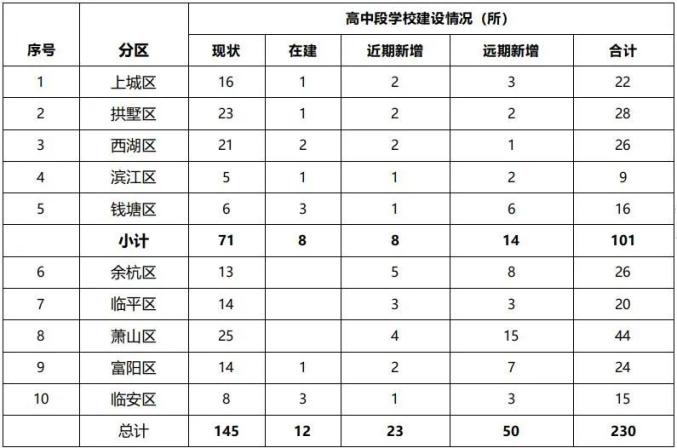 至2035年,杭州市区高中总量达到230所,提供高中学位43.4万生。规划远期(2026-2035年)新建高中学校50所,其中上城区3所,拱墅区2所,西湖区1所,滨江区2所,钱塘区6所,萧山区15所,余杭区8所,临平区3所,富阳区7所,临安区3所,可新增高中学位数14.3万生。
