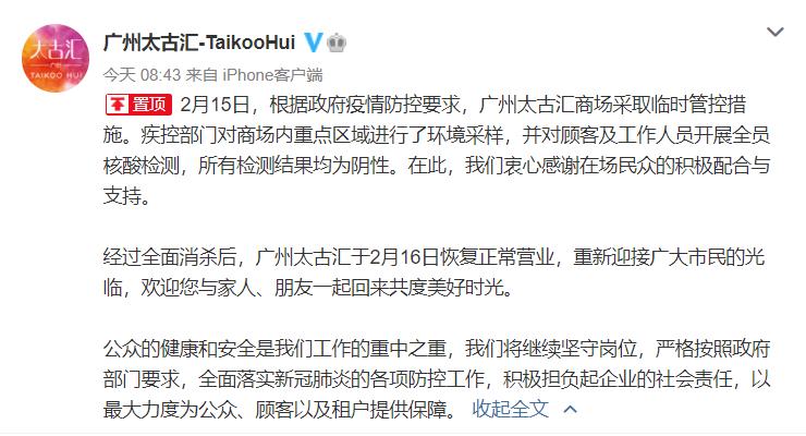 公告称,2月15日,根据政府疫情防控要求,广州太古汇商场采取临时管控措施。疾控部门对商场内重点区域进行了环境采样,并对顾客及工作人员开展全员核酸检测,所有检测结果均为阴性。