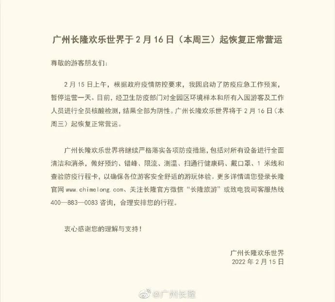 2月15日晚间,@广州长隆 发布公告,长隆欢乐世界2月16日起恢复正常运营。