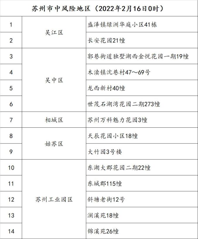 根据国务院联防联控机制有关规定,经专家咨询组综合评估研判,市指挥部决定,自2022年2月16日0时起,将吴江区长安花园21幢、吴中区龙西新村40幢、吴中区世茂石湖湾花园二期273幢、相城区苏州万科魅力花园3幢、姑苏区大竹园3号楼、苏州工业园区澜溪苑18幢、苏州工业园区锦溪苑26幢等7地调整为中风险地区。