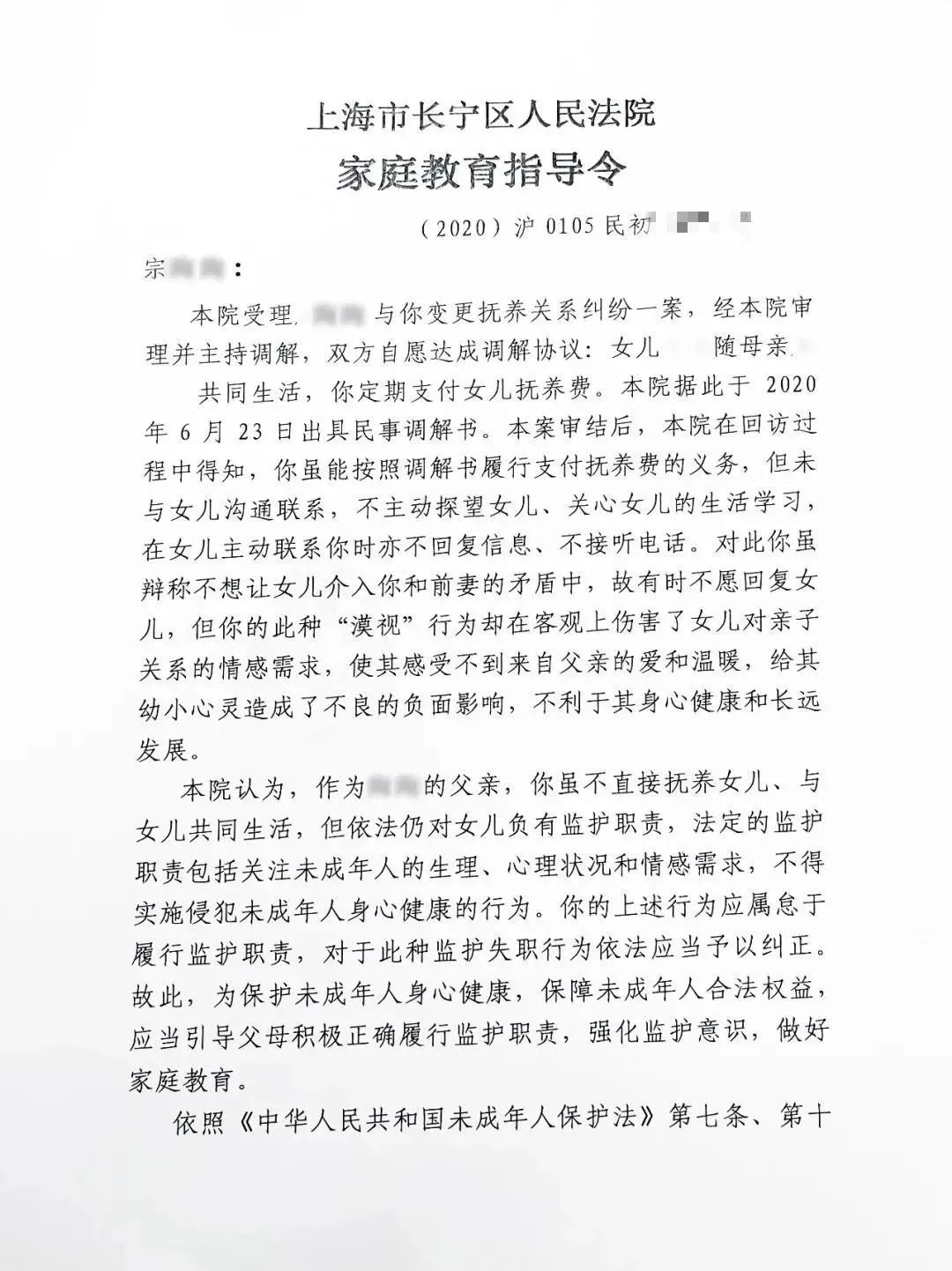 对此,长宁区检察院向区法院制发《责令接受家庭教育指导建议书》,建议法院向宗某某制发《家庭教育指导令》,督促其在依法履行调解协议的同时,正确行使对女儿的探望权,主动增进与女儿的沟通联系和情感交流,关心、关注女儿的生活学习和身心健康。这是自《家庭教育促进法》今年1月1日施行以来,上海市发出的首份《家庭教育指导令》。