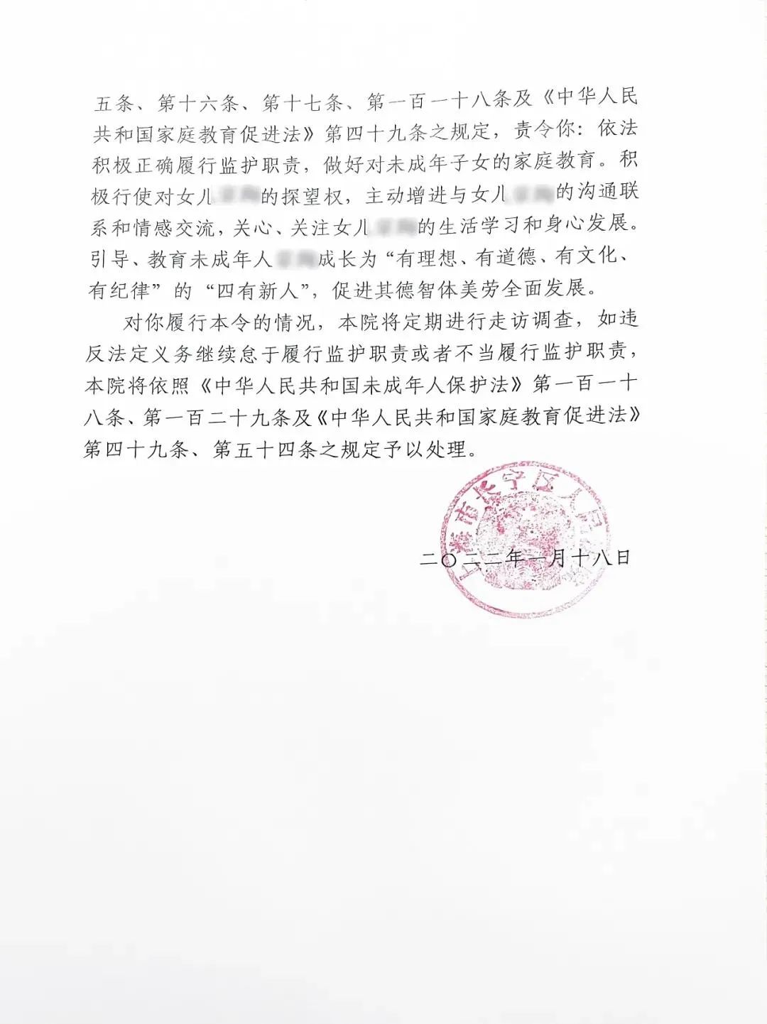 2022年2月14日上午,在上海市宝山区人民检察院出具《家庭教育指导建议书》后,上海市宝山区人民法院执行干警曾建琼向义务人李先生宣读了《家庭教育指导令》。