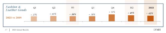 此外,2021年第四季度集团时装和皮具业务创历史新高,较疫情前的2019年同期实现了51%的增长。