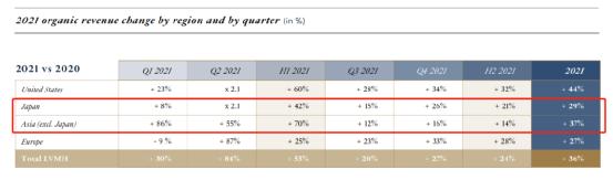 其中,具体业务里的时装和皮具业务在2021年实现128.42亿欧元利润,相较于2020年同期增长了79%;香水化妆品业务在2021年实现了6.84亿欧元的利润,相较于2020年同期涨幅超200%,而手表珠宝类业务2021年利润同样也实现了超200%的增幅。
