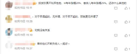 对于中国奢侈品牌纷纷提价,网友们调侃,按20%的涨幅来看,妥妥的理财产品,“投资真不如买包”、“买啥股票,买包吧”,也有网友表示“涨价对于对于买得起的来说无所谓,对于买不起的,那就更无所谓了”;有的则直言“只要我不买,就涨不到我身上”、“和我无关”。
