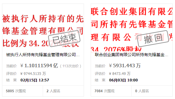 时隔一年多,先锋基金的大股东联合创业集团34.21%股权的拍卖在近期终于完成了,此前,该部分股权曾在2020年4月公开竞拍,随后被撤回。2022年2月15日完成竞拍,成交价格为1.1亿元。