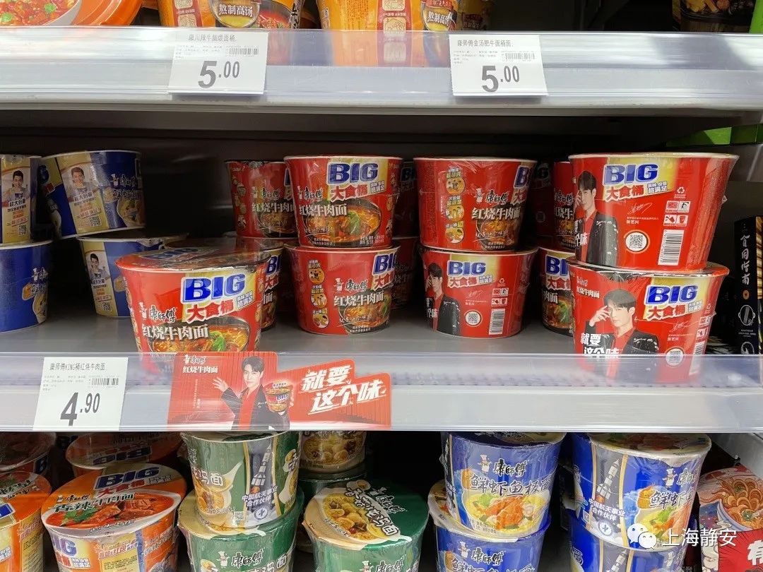 在静安区五月花广场的盒马鲜生同样的康师傅产品单价为14.9元,折合每包2.98元。