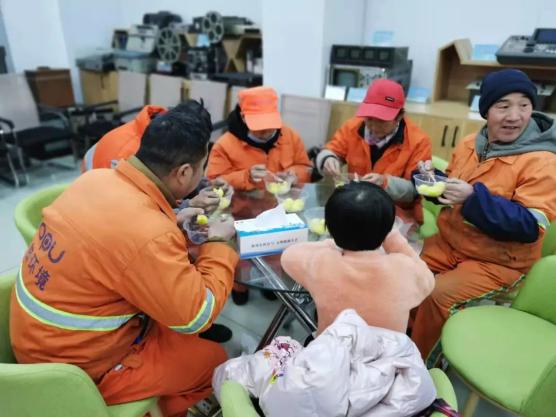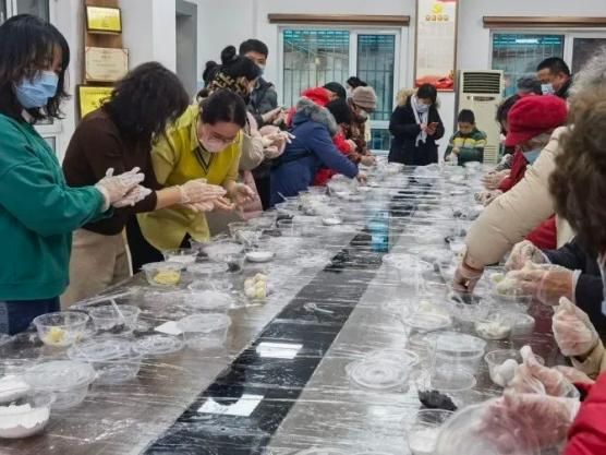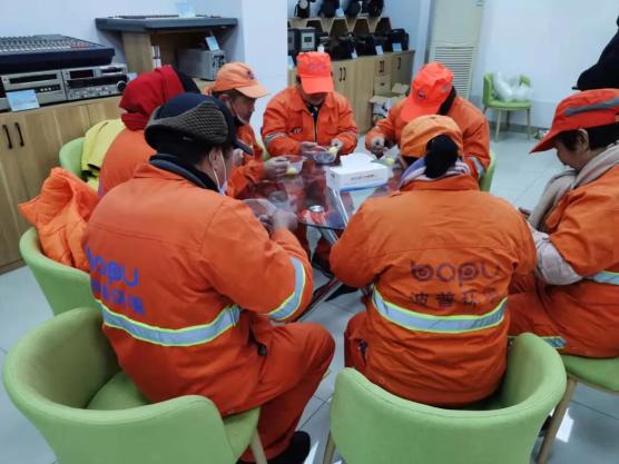 在网格员的指导下,大家用提前准备好的糯米面粉、黑芝麻、豆沙等开始制作元宵,活动现场一派热闹景象,不一会儿,一个个充满爱心的汤圆逐渐成形。工作人员为环卫工人端上一碗碗热腾腾的元宵,向节日期间坚守在一线工作岗位上的“城市最美守护者”表示敬意,把浓浓的关爱之情送给环卫工人,让他们感受节日的温暖。