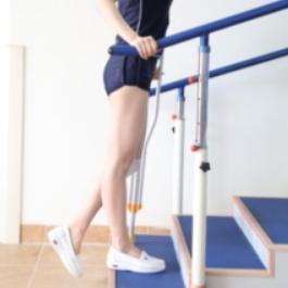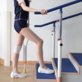 下楼梯时,健手撑扶手,拐杖先下移一级楼梯,患肢随后下移到同一级楼梯,健肢最后下移。