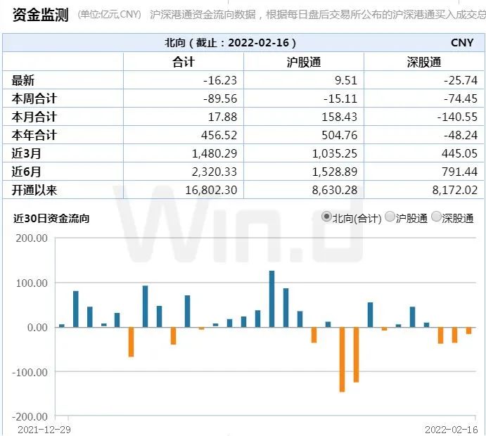 北向资金2月16日净卖出16.23亿元,近3日连续净卖出累计近90亿元。沪股通净买入9.51亿元;深股通净卖出25.74亿元,为连续10日净卖出。