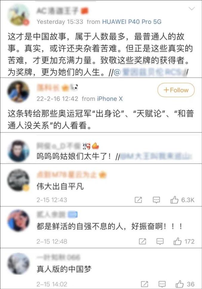 2月15日,三个奥运冠军家庭的老照片在社交平台走红后,很多网友深受触动,有人留言称,姑娘们太牛了,她们用自己的奋斗打破了“冰雪运动和普通人没关系”的说法,“正是这些真实的苦难,才更加充满力量。致敬这些奖牌的获得者。为奖牌,更为她们的人生。”
