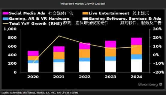元宇宙ETF在海外资本市场表现热烈。截至目前,海外已经发行了6只以元宇宙命名的ETF,其中有2只来自美国,4只来自韩国。彭博汇编数据去年12月的预测,元宇宙的市场机会将在2024年达到8000亿美元左右,而方舟投资研究也预估,来自虚拟电子世界的利润将在2025年达到4000亿美元。