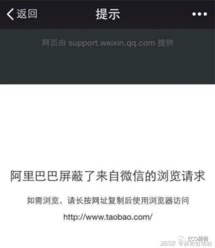 当时好友分享淘宝链接后微信是这样提示的:“阿里巴巴屏蔽了来自微信的浏览请求”。不久后这一措辞变为“如需浏览,请长按网址复制后使用浏览器访问”。