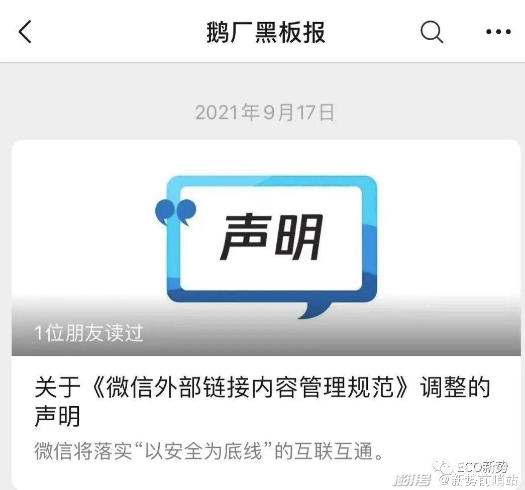 但是很快,微信仍然率先回应了互联互通。9月17日,微信发布“《微信外部链接内容管理规范》调整声明”,微信将会“依据相关法律要求,经监管部门审批,以安全为底线来推进‘分阶段、分步骤’的互联互通方案。”