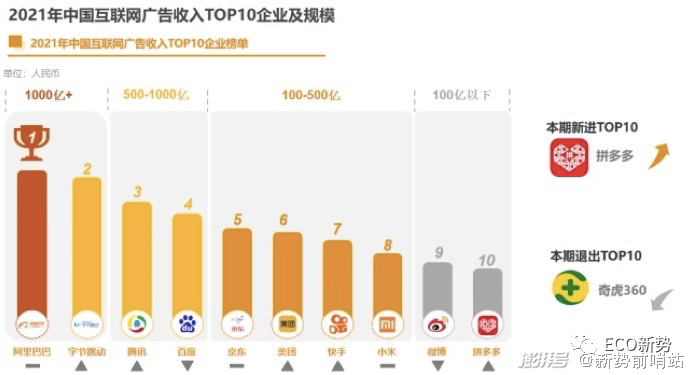 比起昂贵的百度竞价推广,微博段子手、短视频红人们既有超强的曝光度,又有相对低廉的价格,越来越多广告主选择将广告投放到微博、小红书、抖音等平台。《2021年中国互联网广告数据报告》显示,在2021年中国互联网广告收入前十位企业中,除了阿里巴巴位列榜首,字节跳动力压腾讯、百度,坐上第二把交椅,短视频广告已成为互联网营销的新焦点。