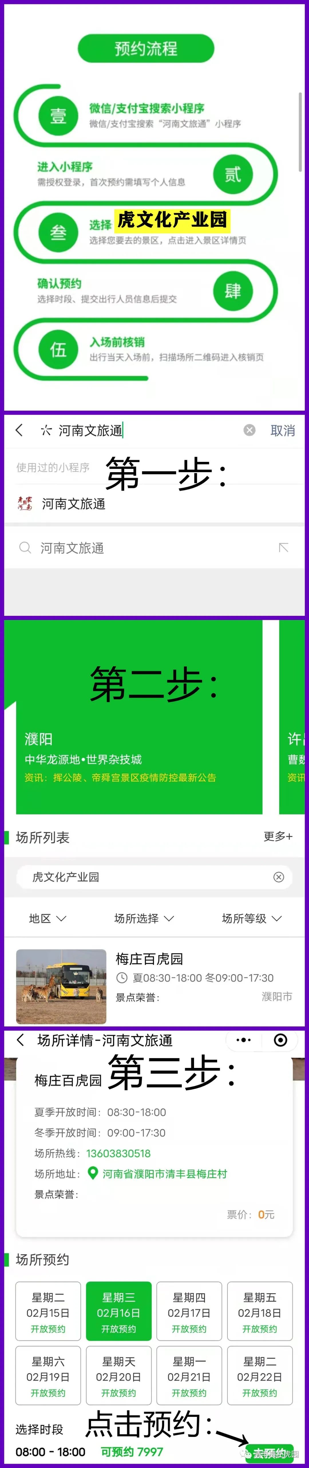 微信/支付宝,搜索小程序“河南文旅通”,填写个人信息后,搜索“虎文化产业园”,根据您的出行时间进行预约,线上预约的游客到达景区后,扫描景区门口“文旅预约码”,核验成功后快速免费入园~如下图所示: