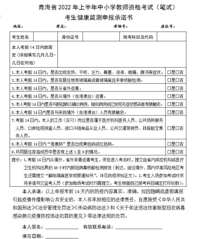 青海省2022年上半年中小学教师资格考试(笔试)考生健康监测申报承诺书