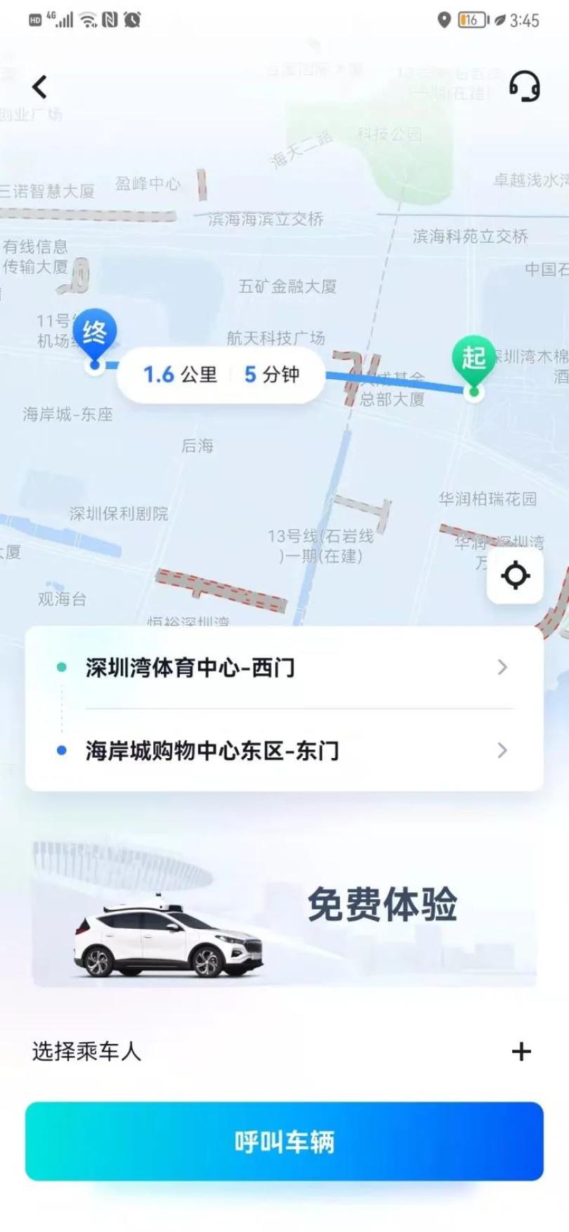 在南山区深圳湾体育中心西门的路边,记者打开“萝卜快跑”App,输入上车点,页面推荐“热门站点”,这些站点包括海岸城购物中心、南山书城、海印长城等,都是目前可以到达的地点,输入下车点,页面会显示出距离和行驶时间。由于目前还是免费体验,不会显示费用,点击“呼叫车辆”,即可完成叫车。