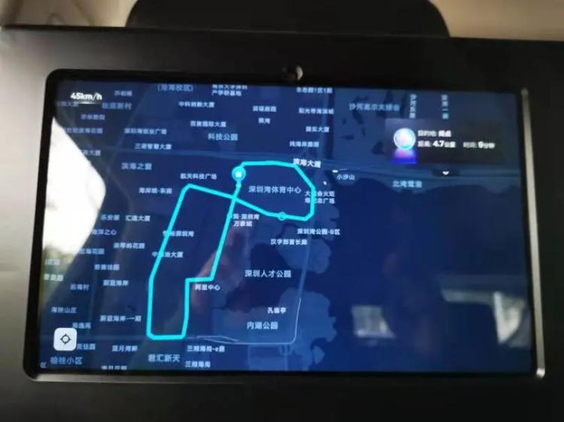 本次记者体验的路程,行驶的起点和终点站均为深圳湾体育中心西门。进入车内,驾驶位上已有一名安全员准备就绪,他的任务不是开车,而是在行驶中保证乘客安全。出发前,安全员对记者进行了测温、出示‘绿码”。在驾驶和副驾驶座位的后方,各有一个屏幕,一切准备完成,点击屏幕上的“开始行程”,汽车缓缓启动。