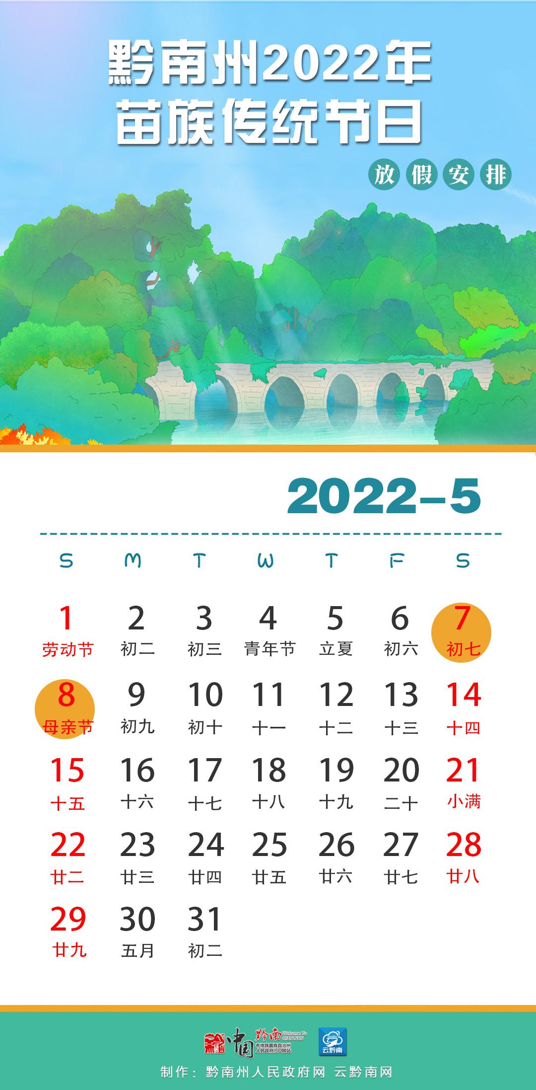 苗族传统节日(农历四月初八,公历5月8日):5月7日(星期六)、5月8日(星期日)放假调休