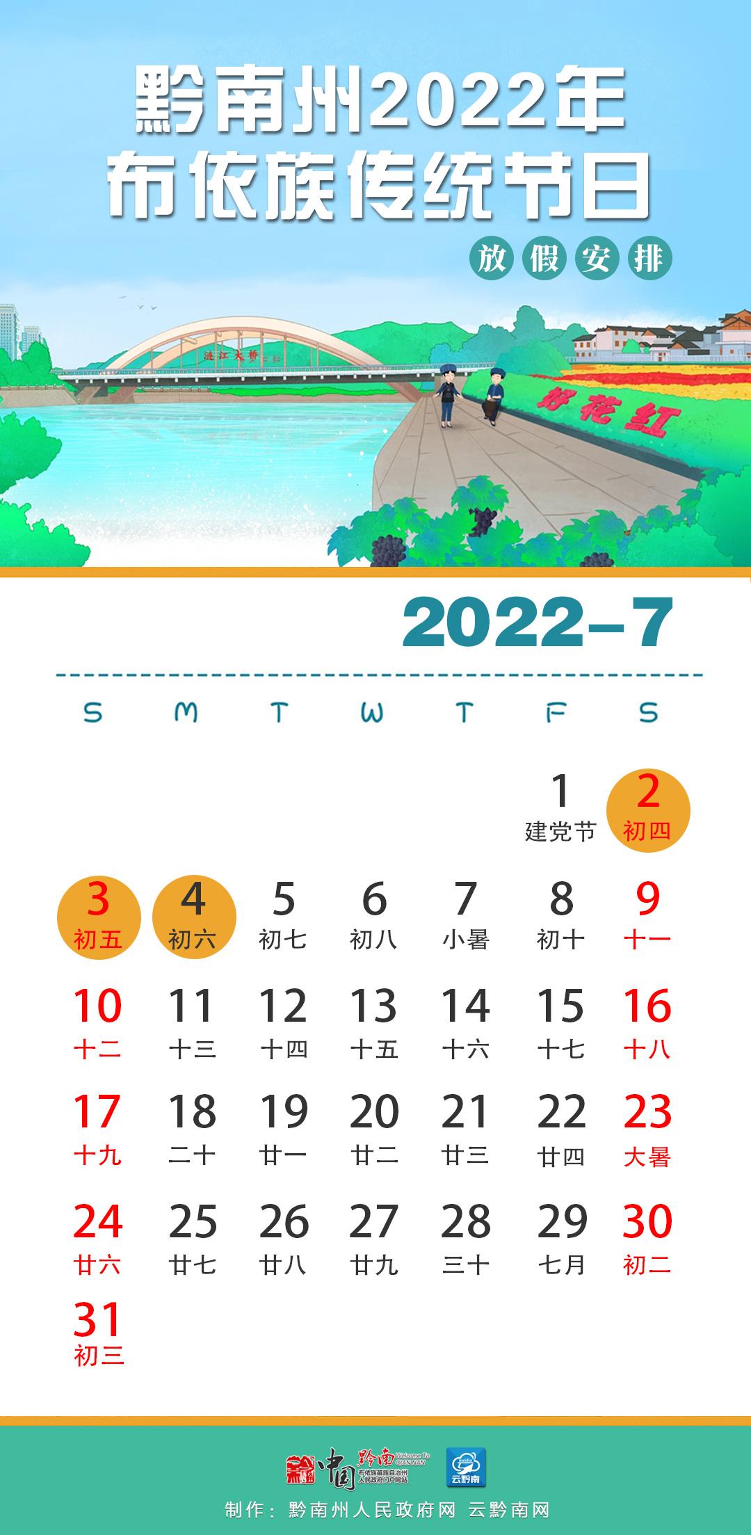 布依族传统节日(农历六月初六,公历7月4日):7月4日(星期一)放假,与周末连休。