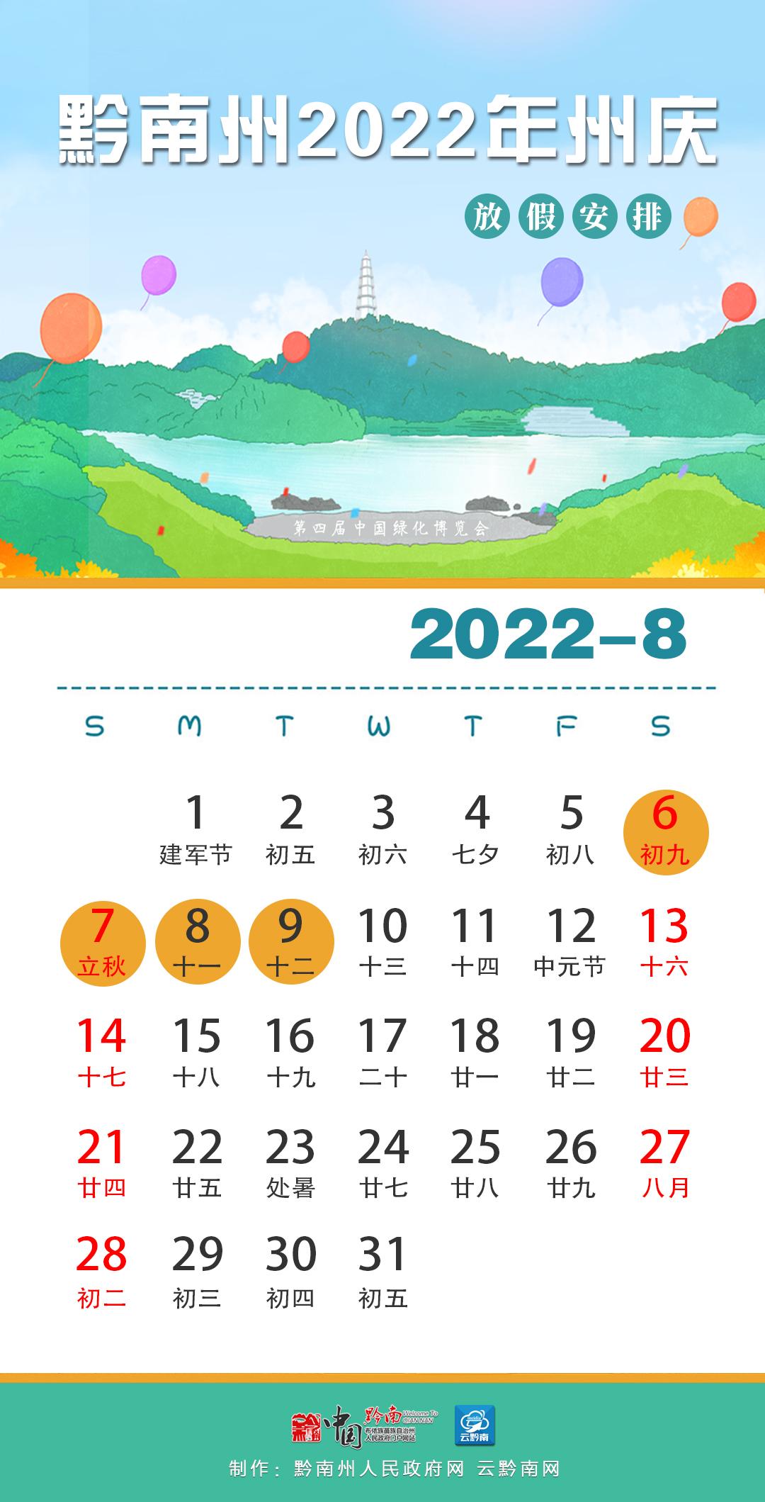 根据《黔南州人民政府办公室关于州庆纪念日和布依族苗族传统节日放假的通知》(黔南府办函[2011]25号)精神,经州委、州政府同意,现将 2022 年民族传统节日和州庆放假安排通知如下: