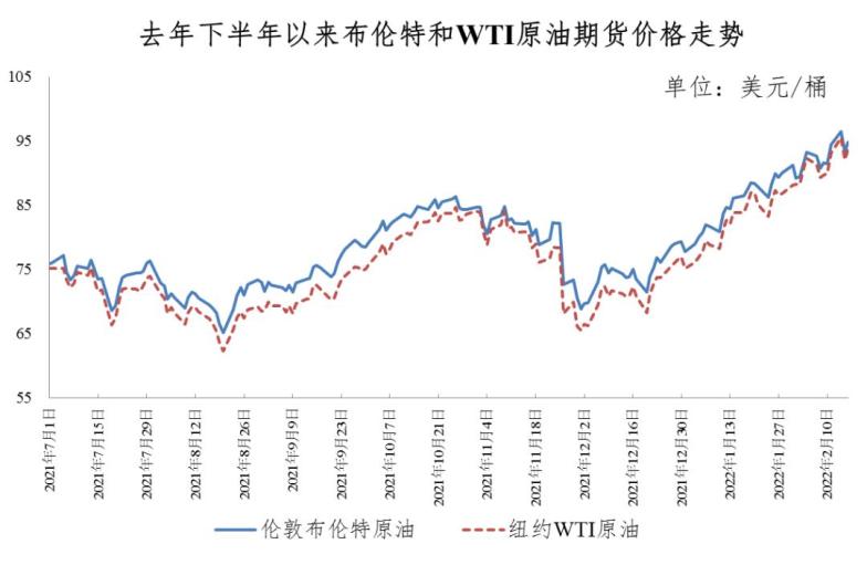 油价因此持续上涨,伦敦布伦特、美国WTI原油期货价格双双突破每桶95美元,均为2014年以来新高。