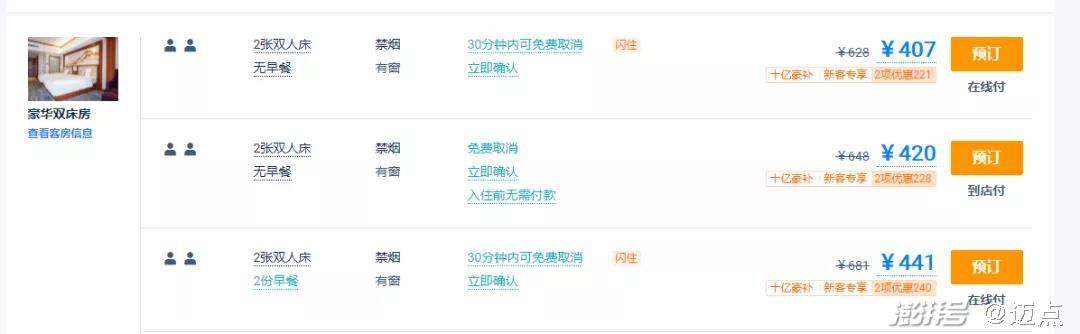 餐饮作为酒店的一部分,一直是酒店提升客房收入的附赠品。据携程大多数酒店页面显示,除了房型不一样,在选择上一般会标识“无早餐”、“有早餐”之分,而在同等条件的房型下,据携程某酒店的页面显示,有早餐的豪华双床房就要比无早餐高了34元。