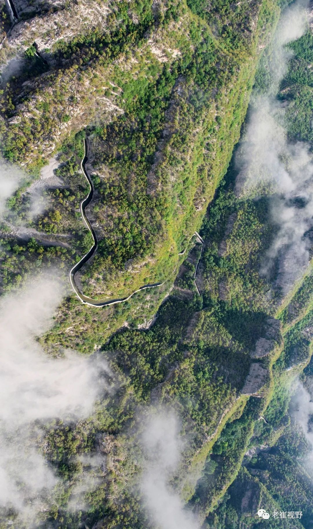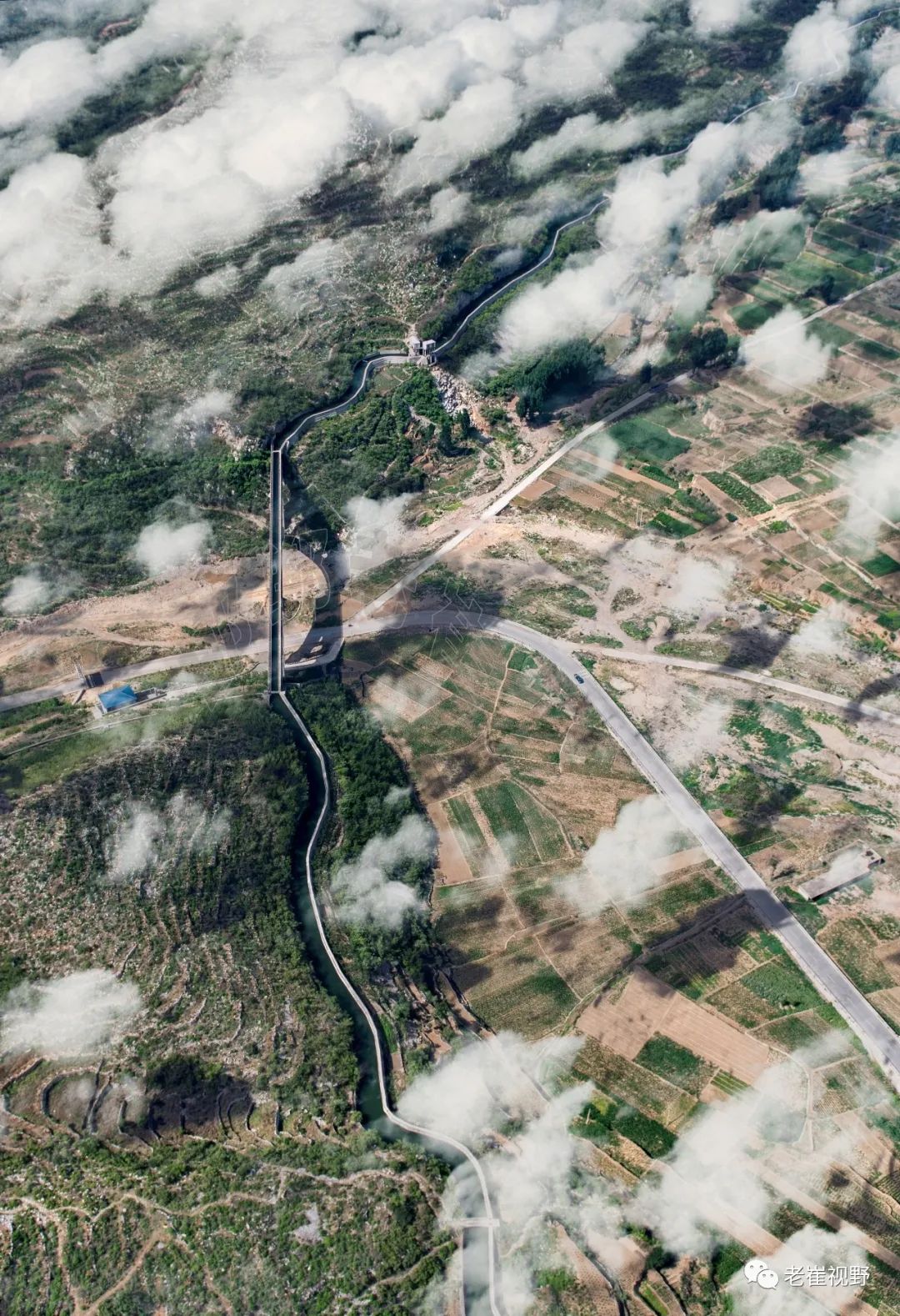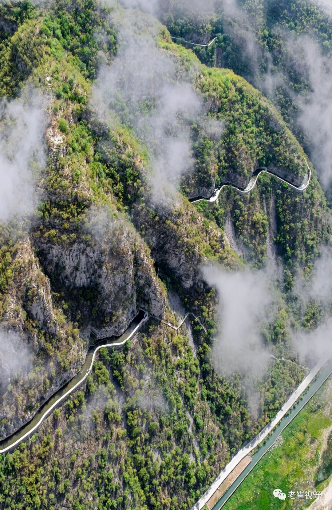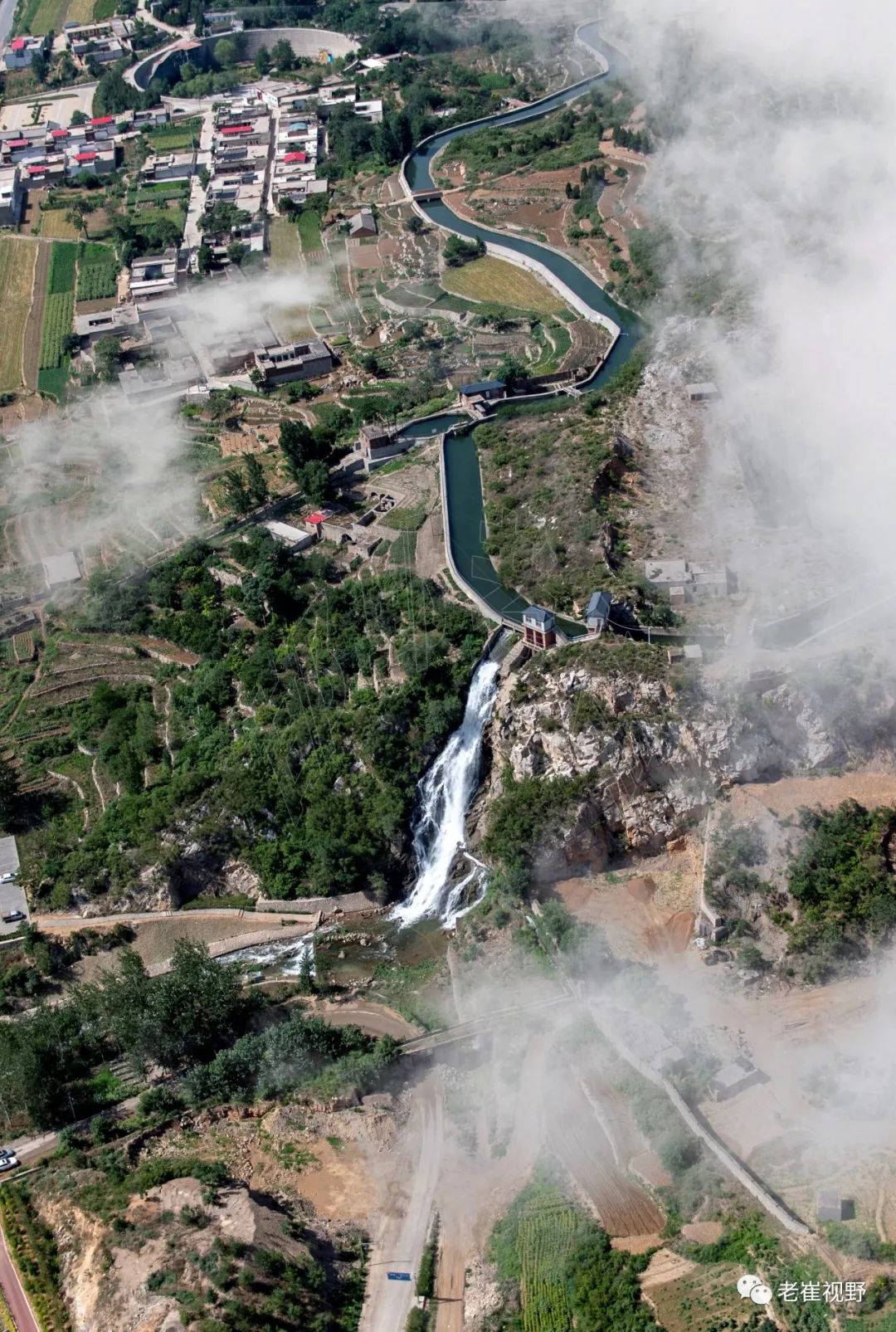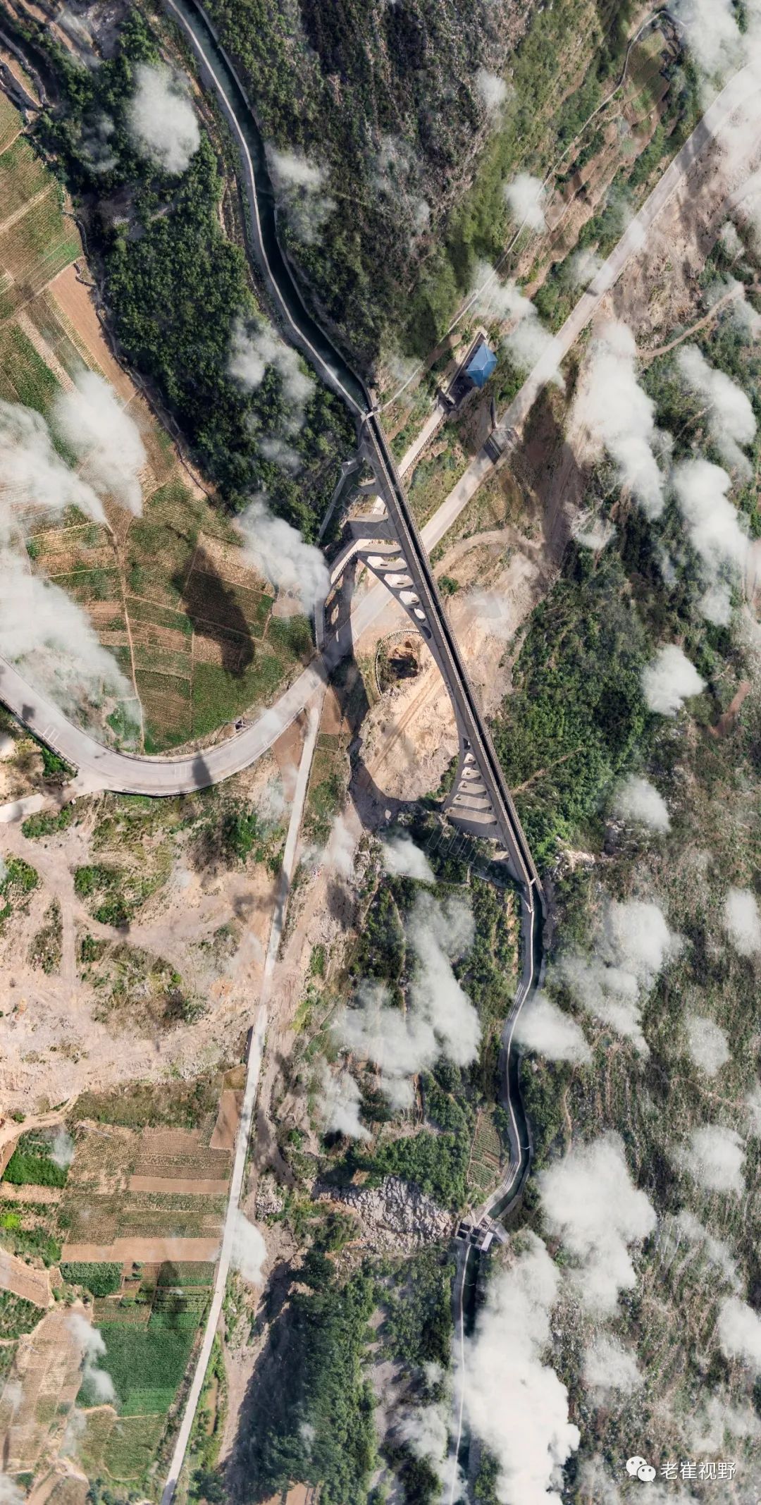 (横屏。团结渡槽和胜利渡槽。过了老刁沟电站,云雾中隐约可见两个相连的渡槽。团结渡槽长84米,胜利渡槽长125米。摄影@邯郸老崔,2019.6.29)▼