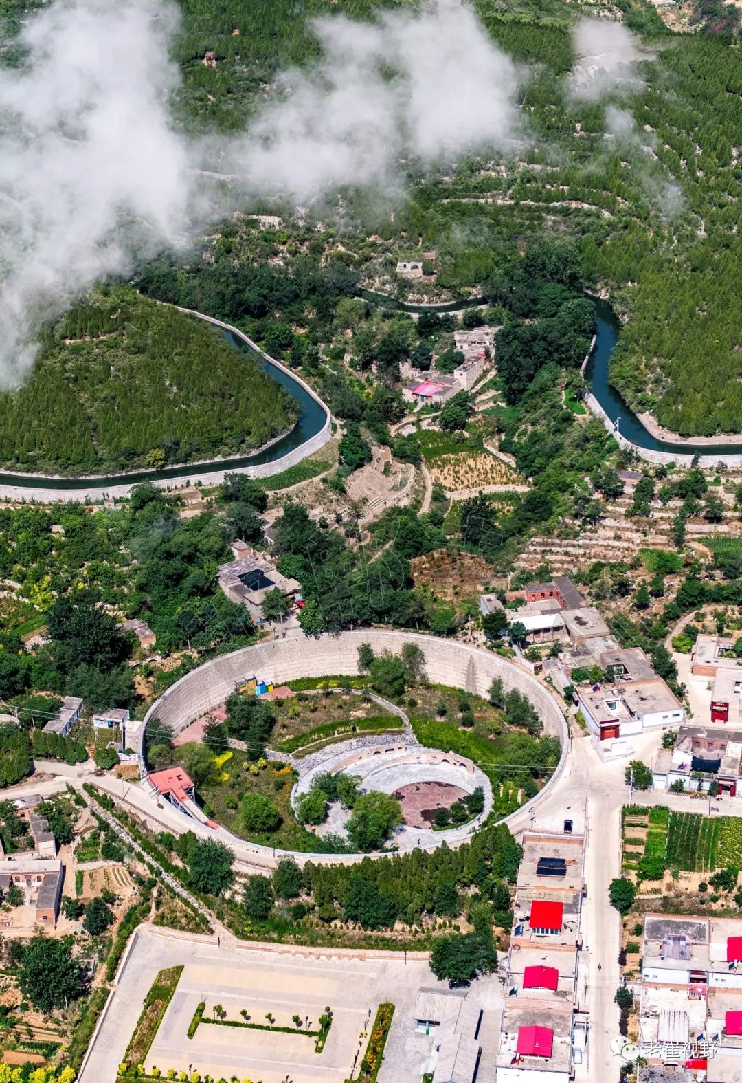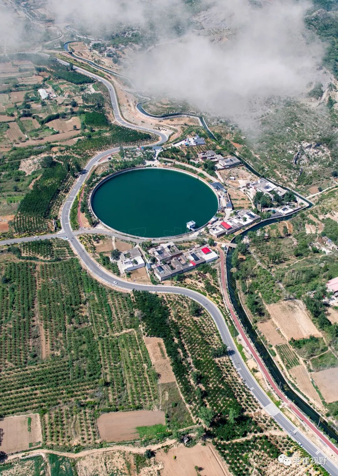 (蓄水池。主干渠沿线,大小不一、形状各异的圈圈超过20个,它最初的功能是蓄水。这个位于峰峰西山村的蓄水池,已经改造成了村民活动中心。摄影@邯郸老崔,2019.6.29)▼