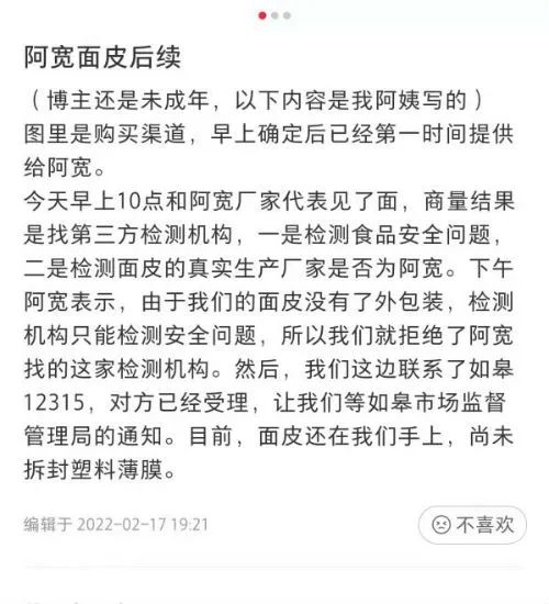 2月17日,消费者方与阿宽方面的相关负责人在无锡进行了会面。据其讲述,当时,阿宽方面表示,将面饼交由第三方检测机构,可以通过检测其中物质判断是否由阿宽家生产,“因为他们觉得我们的购买渠道不是官方的,有可能是假货。”
