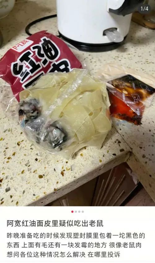 该事件最先发酵是在2月16日,有用户在小红书上发表“阿宽红油面皮里疑似吃出老鼠”的笔记,该用户在笔记中写到:塑封膜里包着一坨黑色的东西,上面有毛,还有一块发霉的地方,很像老鼠肉。