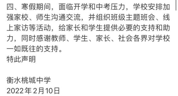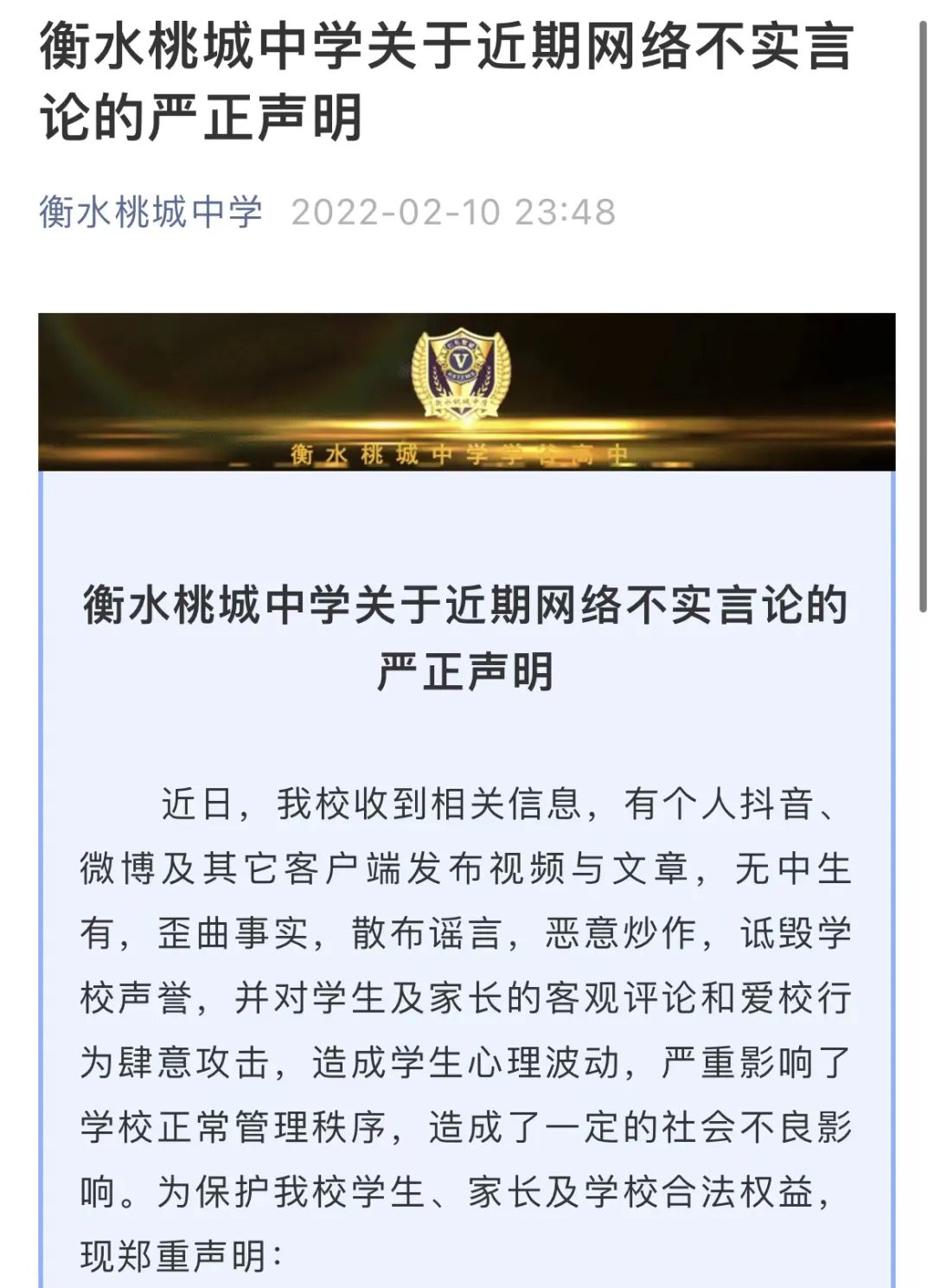 2月10日,衡水桃城中学在其官方微信公众号上发布《衡水桃城中学关于近期网络不实言论的严正声明》。