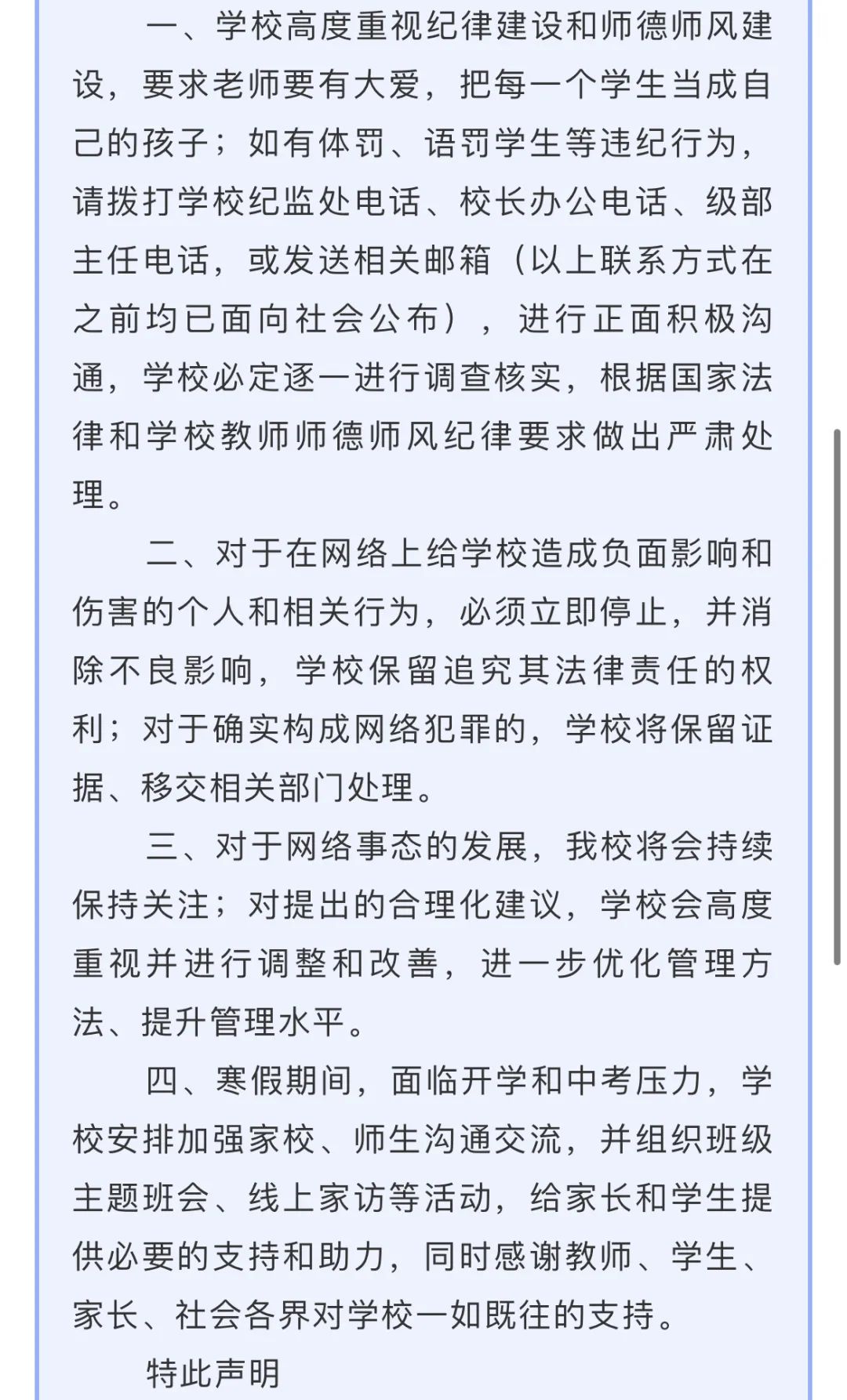 衡水桃城中学声明表示,如有体罚、“语罚”学生等违纪行为,请拨打相关电话,进行正面积极沟通,学校必定逐一进行调查核实,根据国家法律和学校教师师德师风纪律要求做出严肃处理。