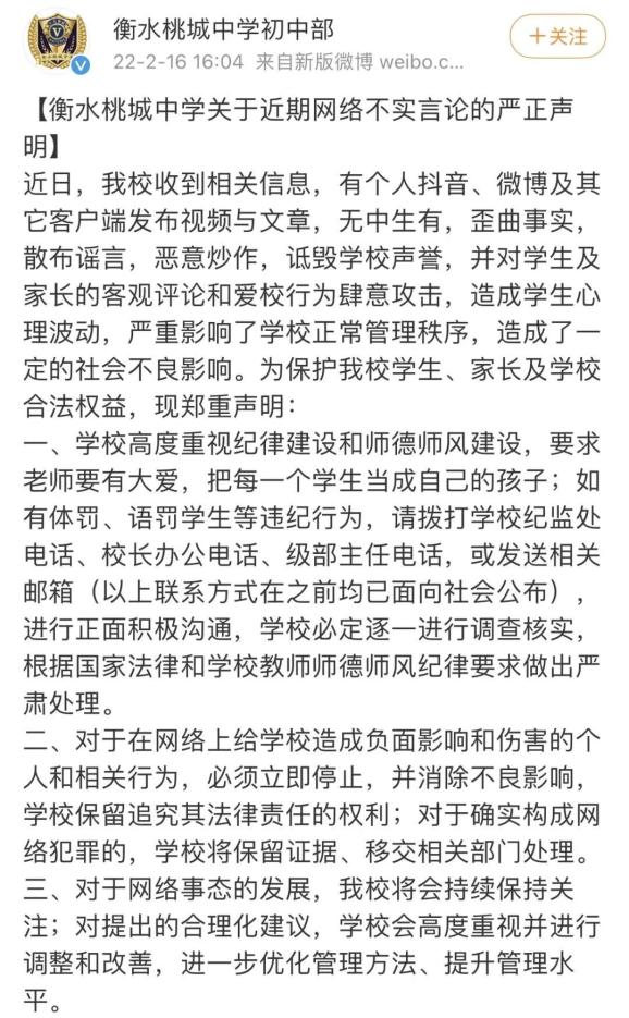 而在2月10日、16日,衡水桃城中学分别在官方公众号和@衡水桃城中学初中部 官方微博回应称,近期网络言论为不实言论。