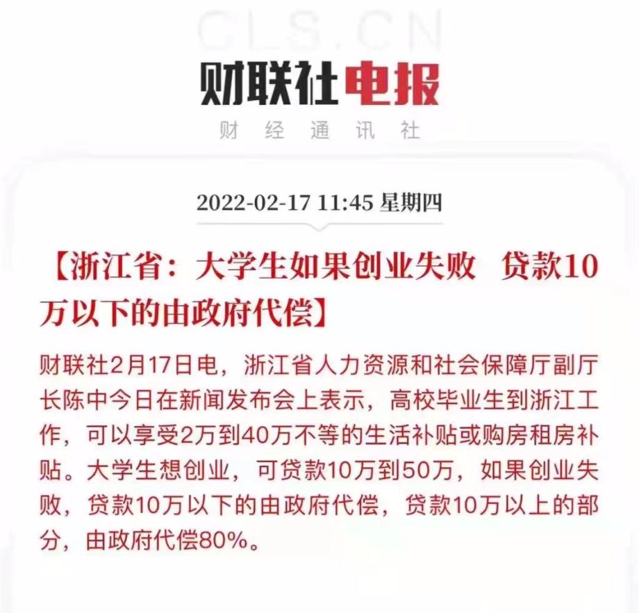 并且,虽然这次偿债的说法最受关注,但浙江利好大学毕业生创业的政策,其实是一揽子的。比如,就还包括: