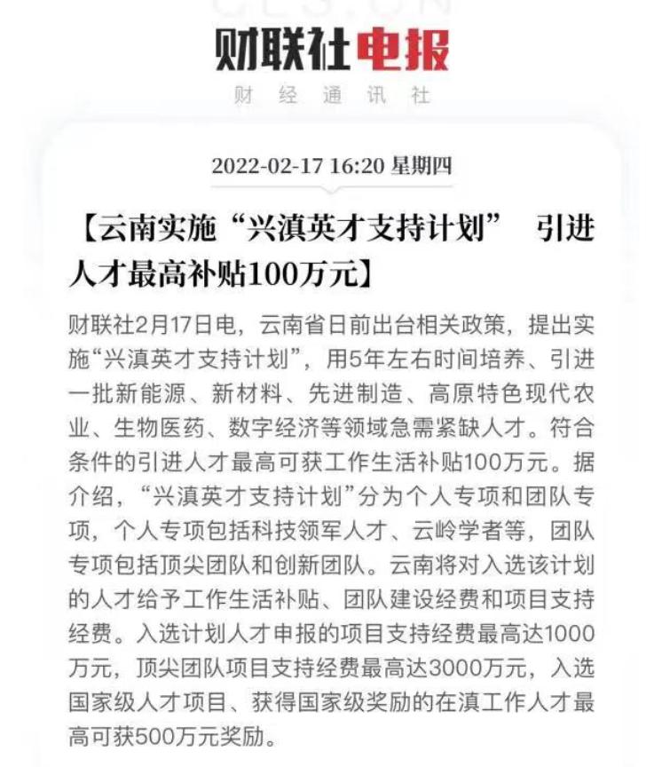 另外,同样在今天,还有一个值得注意的标志性事件是,作为西部省份的云南提出了实施“兴滇英才支持计划”,并且也是直接拿出真金白银。