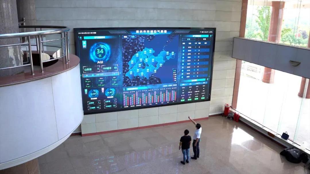 2021年8月,市直机关综合办公大楼一楼大厅内立起了一台LED大屏,实时显示全市16个县市区的六项污染物及综合指数数值,以及潍坊在全国168个重点城市及全省的排名、各县市区及镇街排名、近三年同比改善状况等实时数据。将全市空气质量实时显示在广大领导干部们每天上下班的“必经之处”,一方面是刀刃向内倒逼部门履行治污责任,另一方面也是对全市环保成效的一种自信。