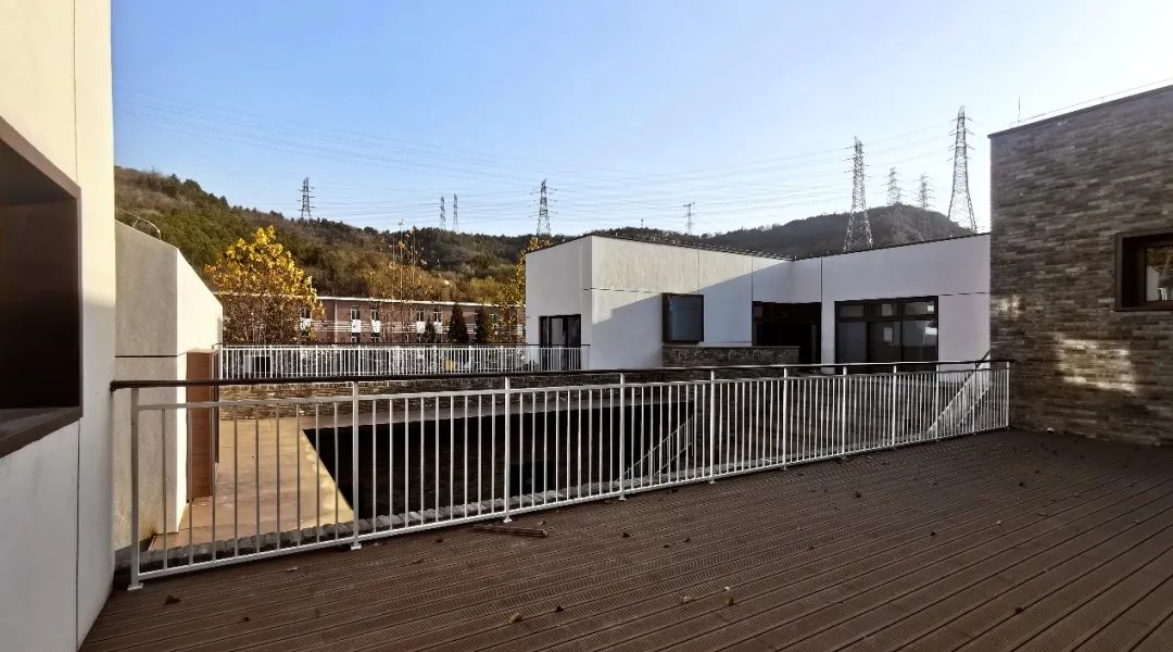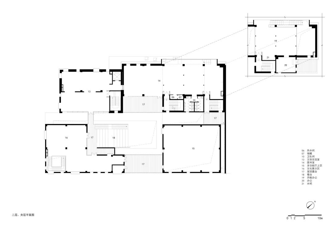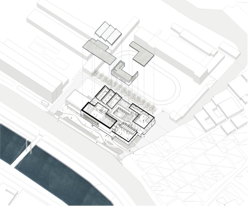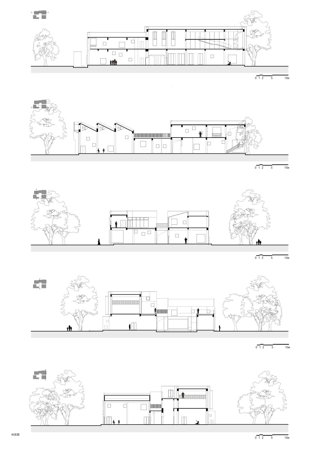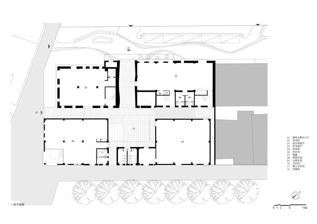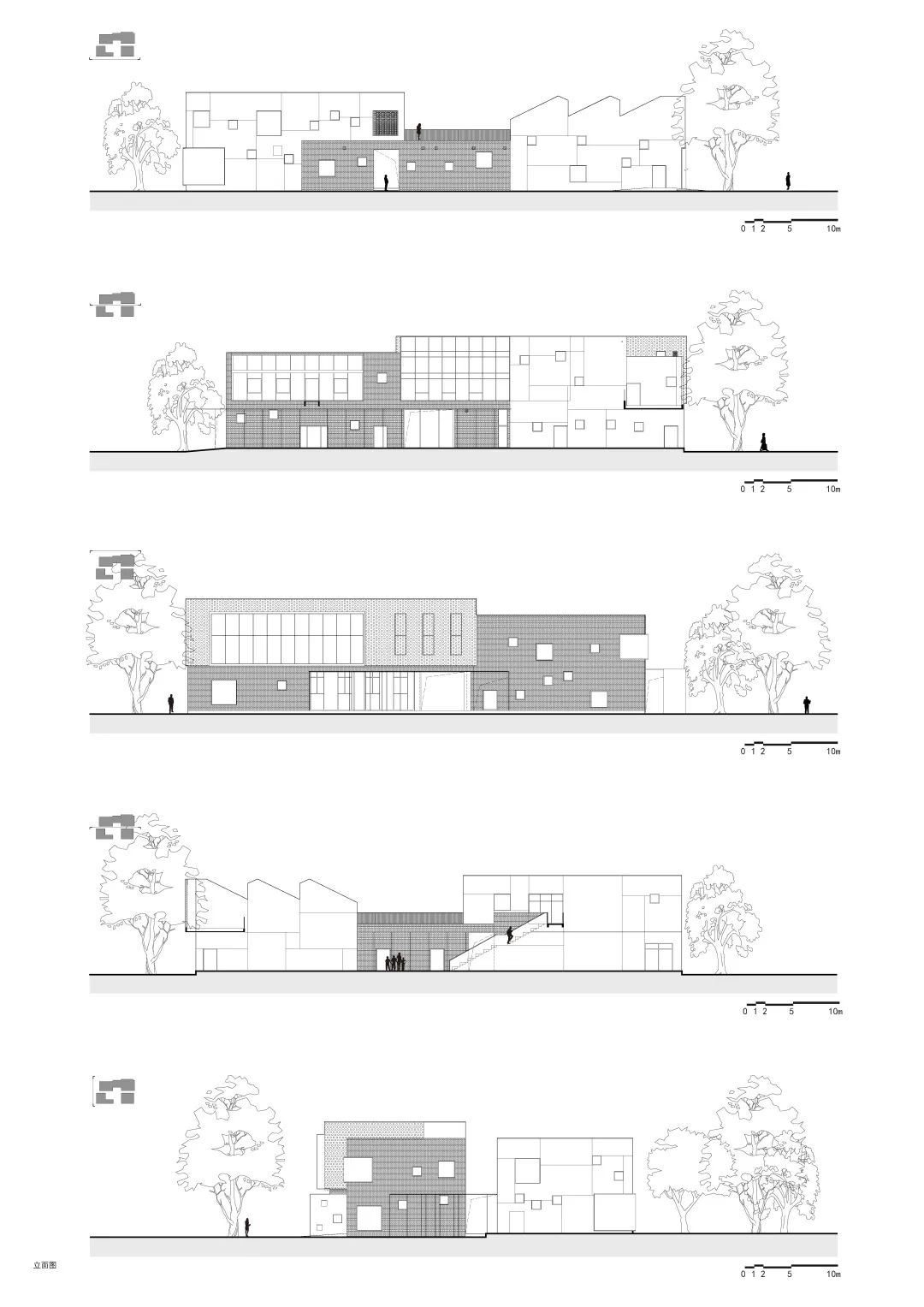 文化中心强调了与周边社区环境的和谐共生与情感联系。向南开敞的屋顶露台,可以近距离欣赏四平山连绵起伏的山景;北向二层增加出挑的阳台,走上舒缓的台阶,透过落地的玻璃,可以俯瞰高井沟内夏季的水景绿意和冬季的冰雪活动;中央看台向东,可以远眺三座标志性的冷却塔;建筑二层向西,可以俯瞰成片的社区家园,居民的集体记忆尽收眼底。此外,文化中心西侧退让了宽阔的通道,方便电厂路小学的进出;二层露台提供给家长观看小学运动场上孩子们运动的场地;一层的咖啡厅为家长提供了舒适的等候空间(图10)。