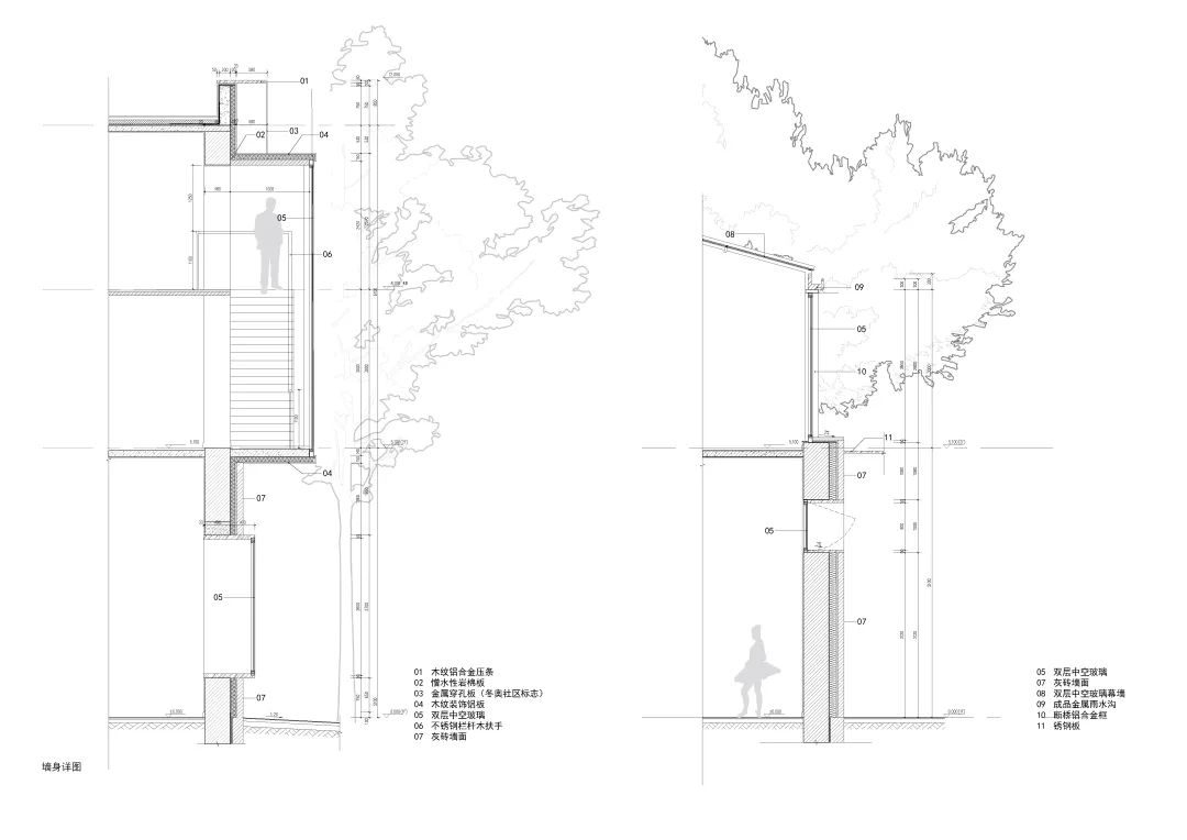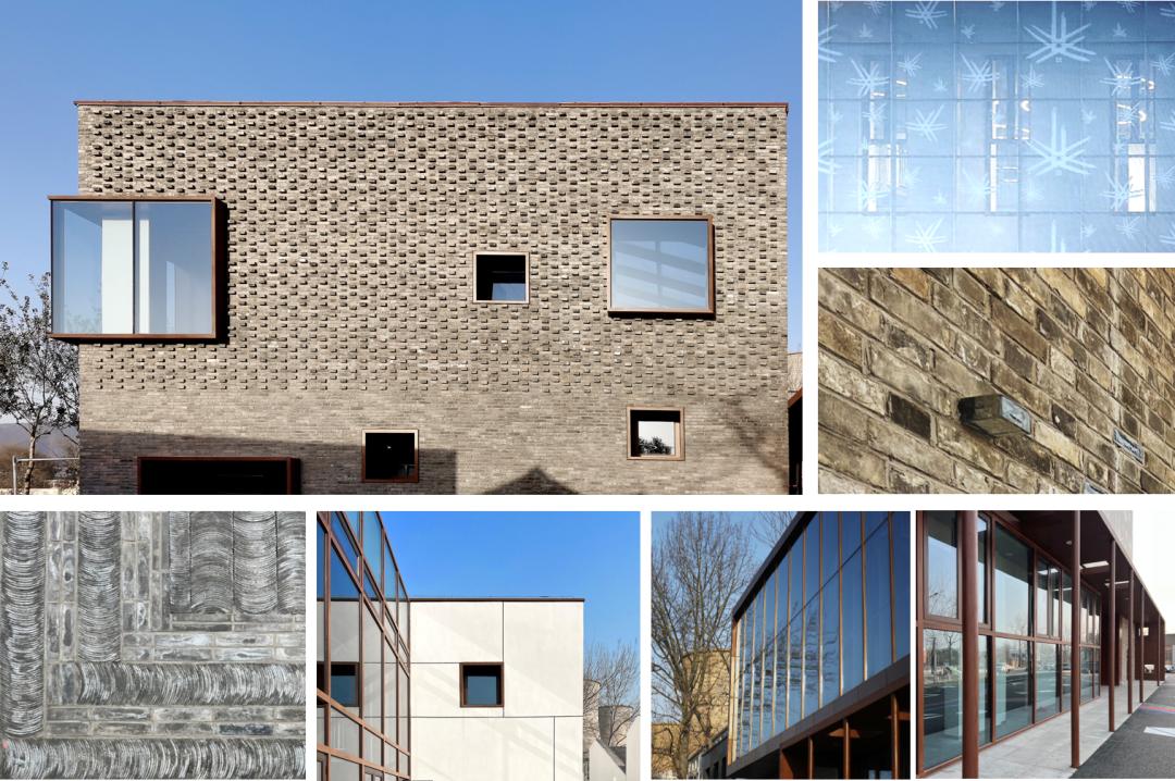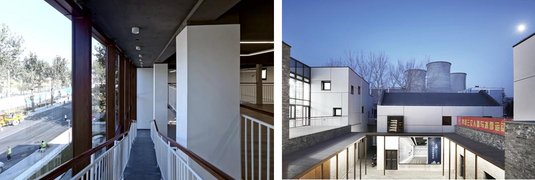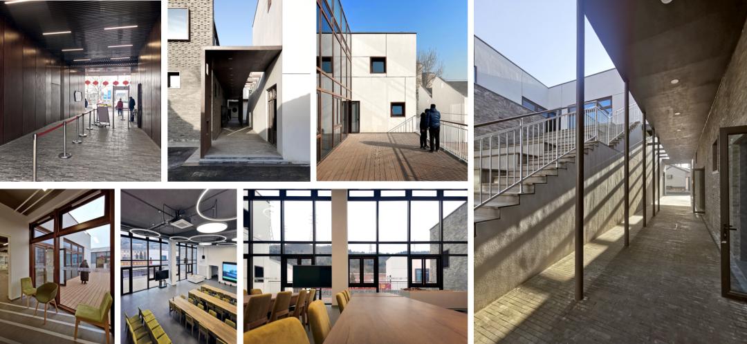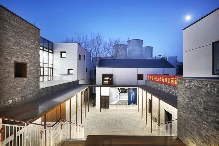 文化中心的建筑外观,以灰砖、白墙和木窗为主基调,建设过程,共收集了10万块北方地区民居拆除下来的旧砖,回收再利用砌筑起来,再现历史韵味。同时,充分运用钢、玻璃、金属板等现代建筑材料,塑造时代气息。新老元素的碰撞与交融,展现了传统与现代的融合。其中,冰雪纹样的白色穿孔板、雪花样式的灰砖拼花,充分体现冬奥元素;锈钢板的连廊和雨罩,记载可以触摸的首钢老工业历史;老砖墙内嵌的24块玻璃冰砖,向举办冬奥的24个城市致敬(图8)。