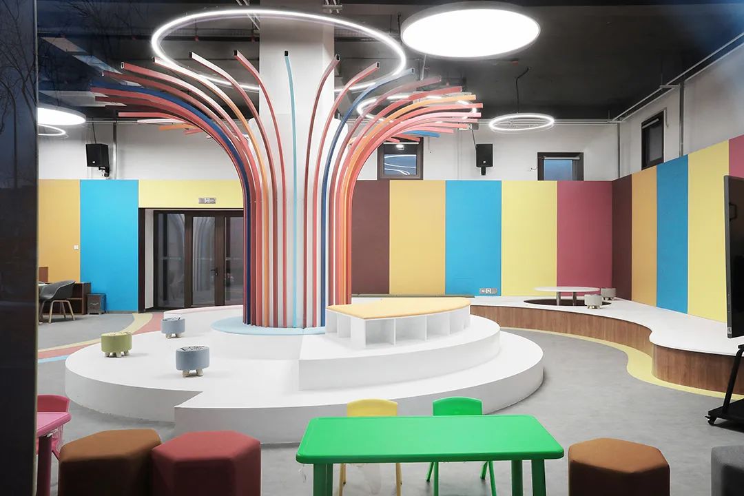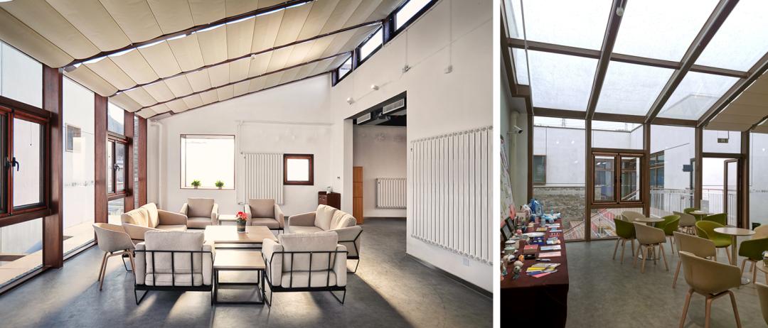 文化中心着重考虑老年和儿童的使用特点。建筑内外均可无障碍到达,各入口处设置缓坡,替代台阶,确保老年人行走、活动的便捷及安全。内院里专设无障碍卫生间,主人口处专设无障碍电梯,每个功能空间增加了无障碍休息专用区域。儿童活动区,内部采用软包装饰,并采用高低错落的书架和条凳,选取木质纹理和多变的色彩,形成安全、有趣并具有丰富功能的儿童活动场所(图11)。