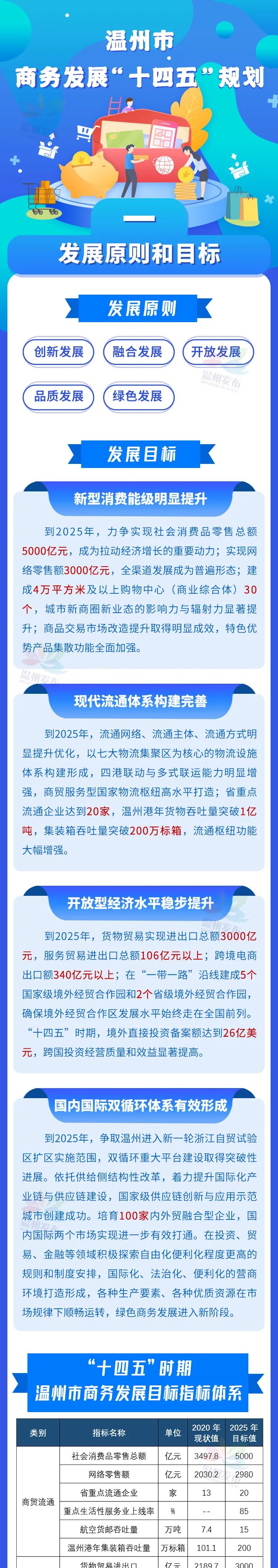 日前,我市发布《温州市商务发展“十四五”规划》,为“十四五”期间的商务工作描绘了发展蓝图。根据《规划》,温州将高水平建设区域消费中心城市、打造开放型经济发展标杆、建设国际会展城市、推进数字商务全面创新、建设现代流通体系、构建一流商务营商环境。