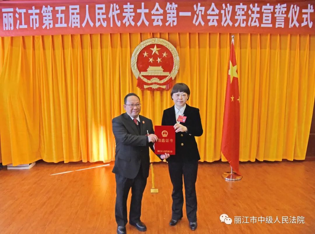 李红斌同志再次全票当选为丽江市中级人民法院院长,中共丽江市委书记浦虹向其颁发当选证书。
