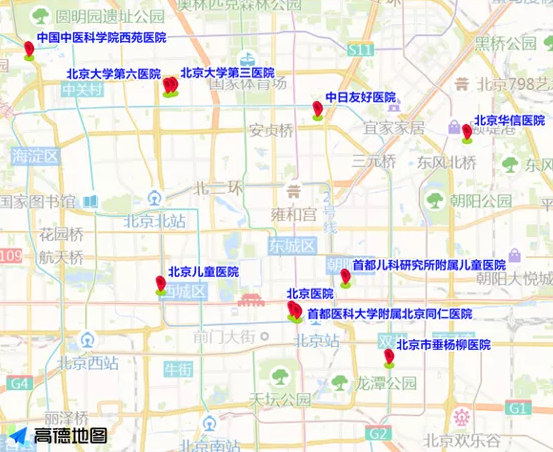 医院方面,北医三院、儿童医院、儿研所、北京医院、同仁医院等医院周边道路和桥区节点将出现车流集中的情况,高峰时段为上午7—10时。