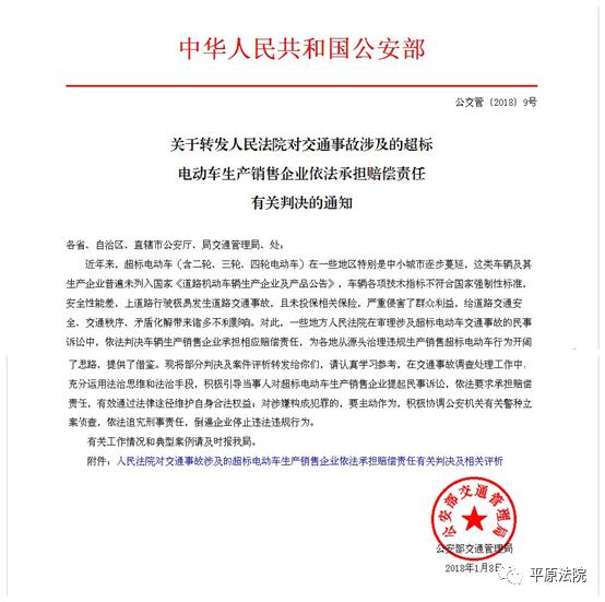 1、公安部关于转发人民法院对交通事故涉及超标电动车生产销售企业依法承担赔偿责任有关判决的通知(2018)