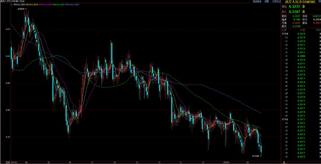 2月18日,离岸人民币兑美元汇率大幅上涨,一度突破6.3200关口,触及近4年新高6.3144,创下2018年5月以来最高点。