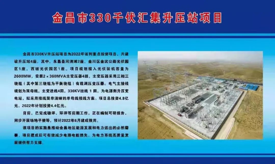 金昌市330KV升压站项目为2022年省列重点投资项目,共建设升压站4座,其中,永昌县河清滩2座,金川区金武公路光伏园区1座,西坡光伏园区1座。项目规划接入光伏装机容量为2600MW,安装2x360MVA主变压器4组,主变压器采用三相三绕组(其中第三绕组为平衡绕组)有载调压变压器。电气主接线规划为双母线,主变进线4回,330KV出线1回,为电源侧升压变电站,拟采用接线简单清晰的单母线接线方案。项目总投资4.8亿元,2022年计划投资4.4亿元。目前,已完成稳评、环评等前期工作,正在编制可研报告,同步开展场地平整等,预计2022年6月建成投用。