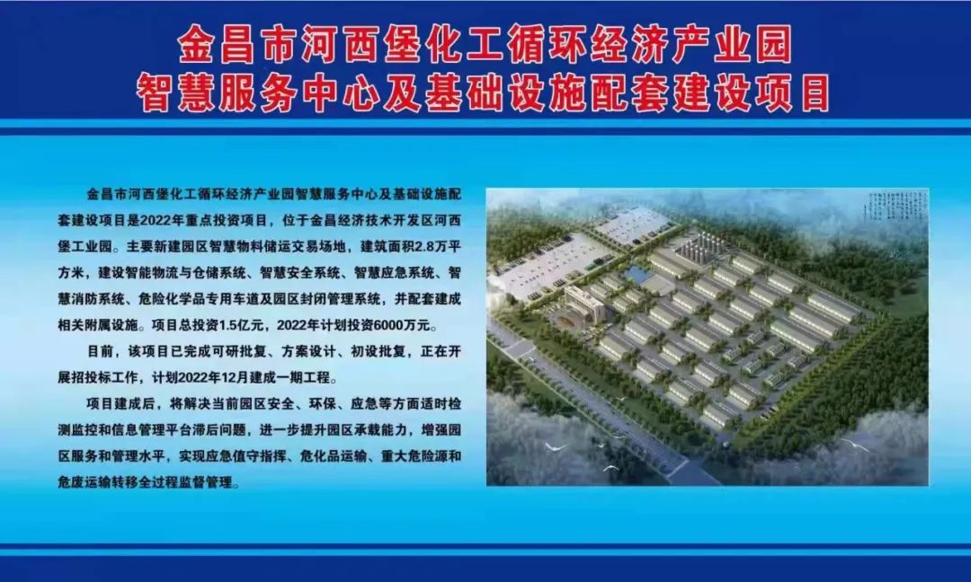 金昌市河西堡化工循环经济产业园智慧服务中心及基础设施配套建设项目是2022年重点投资项目,位于金昌经济技术开发区河西堡工业园。主要新建园区智慧物料储运交易场地,建筑面积2.8万平方米,建设智能物流与仓储系统、智慧安全系统、智慧应急系统、智慧消防系统、危险化学品专用车道及园区封闭管理系统,并配套建成相关附属设施。项目总投资1.5亿元,2022年计划投资6000万元。目前,该项目已完成可研批复、方案设计、初设批复,正在开展招投标工作,计划2022年12月建成一期工程。