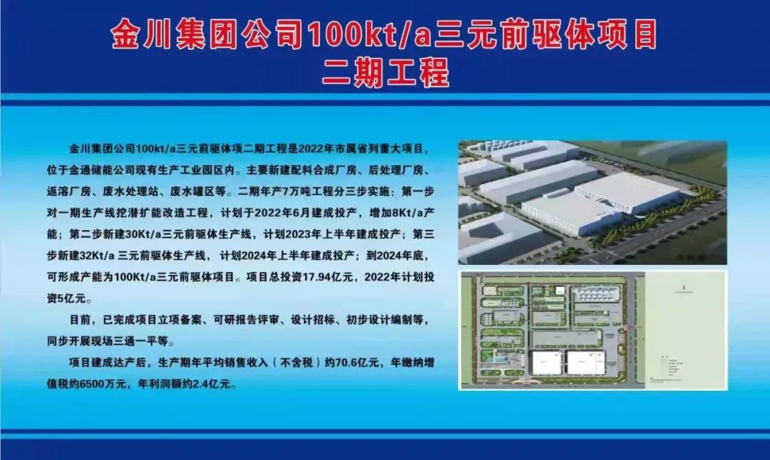金川集团公司100kt/a三元前驱体项目二期工程是2022年市属省列重大项目,位于金通储能公司现有生产工业园区内。主要新建配料合成厂房、后处理厂房、返溶厂房、废水处理站、废水罐区等。二期年产7万吨工程分三步实施:第一步对一期生产线挖潜扩能改造工程,计划于2022年6月建成投产,增加8Kt/a产能;第二步新建30Kt/a三元前驱体生产线,计划2023年上半年建成投产;第三步新建32Kt/a三元前驱体生产线,计划2024年上半年建成投产;到2024年底,可形成产能为100Kt/a三元前驱体项目。项目总投资17.94亿元,2022年计划投资5亿元。目前,已完成项目立项备案、可研报告评审、设计招标、初步设计编制等,同步开展现场三通一平等。